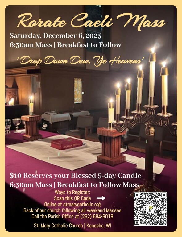 Join us...Saturday morning, December 6, 2025, St. Mary Catholic Church, Kenosha WI, will hold a special Advent Candlelight Mass commonly known as Rorate Caeli. While this Liturgy has deep roots within the history of the Catholic Church, the Advent devotion to the Blessed Mother has somewhat faded in practice throughout the years. Recently, there has been a resurgence within the Church to honor and reintroduce the Rorate Caeli Mass to the faithful and reignite the beauty of our Church's liturgical heritage. $10 Reserves your Blessed 5-day Candle to be provided upon entering the church. Breakfast following the Mass is generously sponsored by the Knights of Columbus. Please sign up if you would like to join us for this very special Advent Candlelight Mass. Candles will be provided upon entering the church. Breakfast to follow Mass, in Bell Hall. Payment can be mailed to (Attn: Rorate Caeli Mass) or dropped off at our parish office at 7307 40th Avenue. If paying via check, please indicate Rorate Caeli Mass in the memo. Payment may also be made at the door. Please Sign Up By November 30, 2025. Click Here to Register: Https://www.signupgenius.com/go/9040A44AEAA2FAAF94-58870361-rorate |